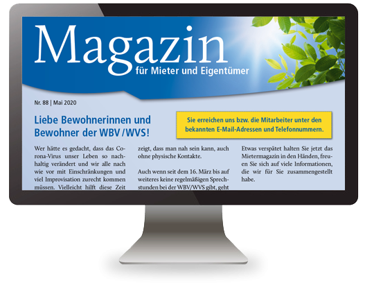 Dreimal im Jahr informieren wir Sie im Mietermagazin über aktuelle Themen der WVS Coswig. Darin finden Sie Energiespartipps, Coswiger Veranstaltungshinweise oder Erläuterungen zu Umbaumaßnahmen. Wenn Sie das Magazin nicht zur Hand haben, können Sie hier in Ruhe blättern.